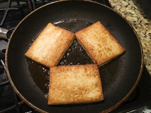 I drained the blocks of tofu and blotted them dry-ish with paper towels.  I cooked the tofu in the only way that I’ve ever really had much success with:  I put a tablespoon or two of sesame oil in a nonstick pan with an equal amount of cooking/canola oil.  I turned on the burner pretty high, and when the oil shimmered, I added one block of tofu.  Today, I tried two ways of cutting up the tofu: in cubes and steaks (to cut into cubes after frying).  Both methods were fine, but I think I prefer the control I have over the color of the steaks.  See how they got nice and brown?