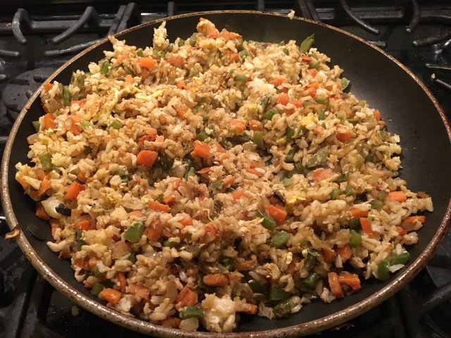 IMG_9460I sauteed the veggies until they were soft, and added a tablespoon or so of jarred minced garlic and some Chinese five-spice powder.  I sauteed for a minute or so until fragrant, then added three or four cups of the cooked rice.  I cracked two eggs on top of the whole thing and stirred it all up, still over the high heat.  Once the eggs were cooked, I seasoned with a couple of tablespoons of soy sauce.