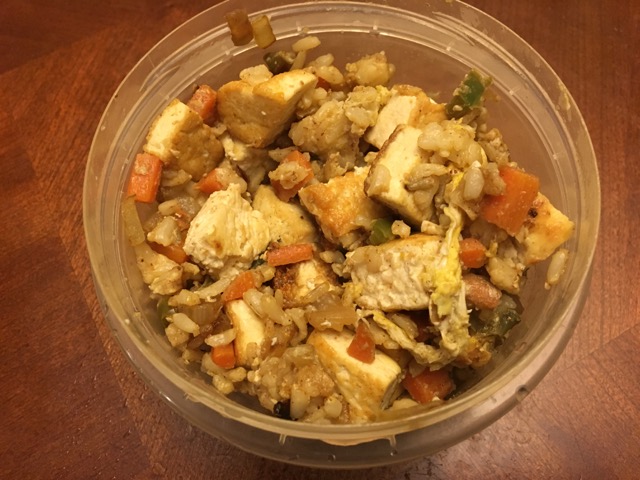 Today was a what’s-in-the-fridge? kind of day.  There was no considering of recipes or shopping for particular ingredients.  I started with the idea of putting some brown rice in the rice cooker.  I had a couple of blocks of extra firm tofu in the fridge.  I had some veggies.  Felt like a stir fry of some kind.