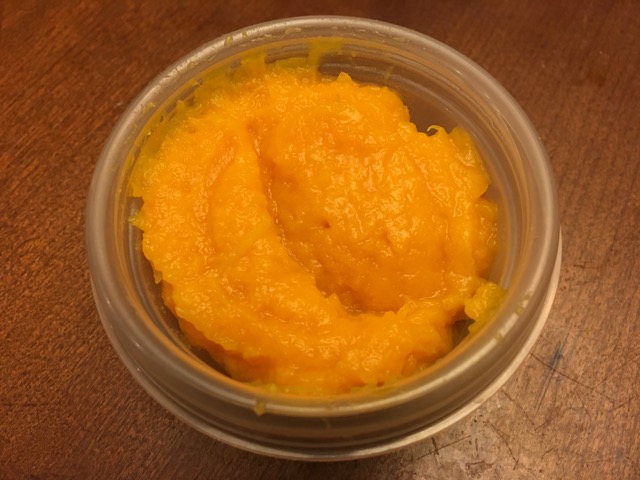 IMG_9468Yes, this has some veggies in it, but I wanted more in M’s lunch.  I had some butternut squash puree leftover from Thanksgiving, so I portioned some into half-cup containers like this: