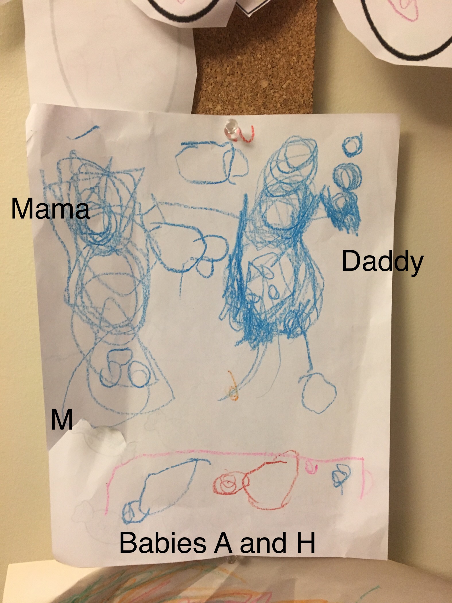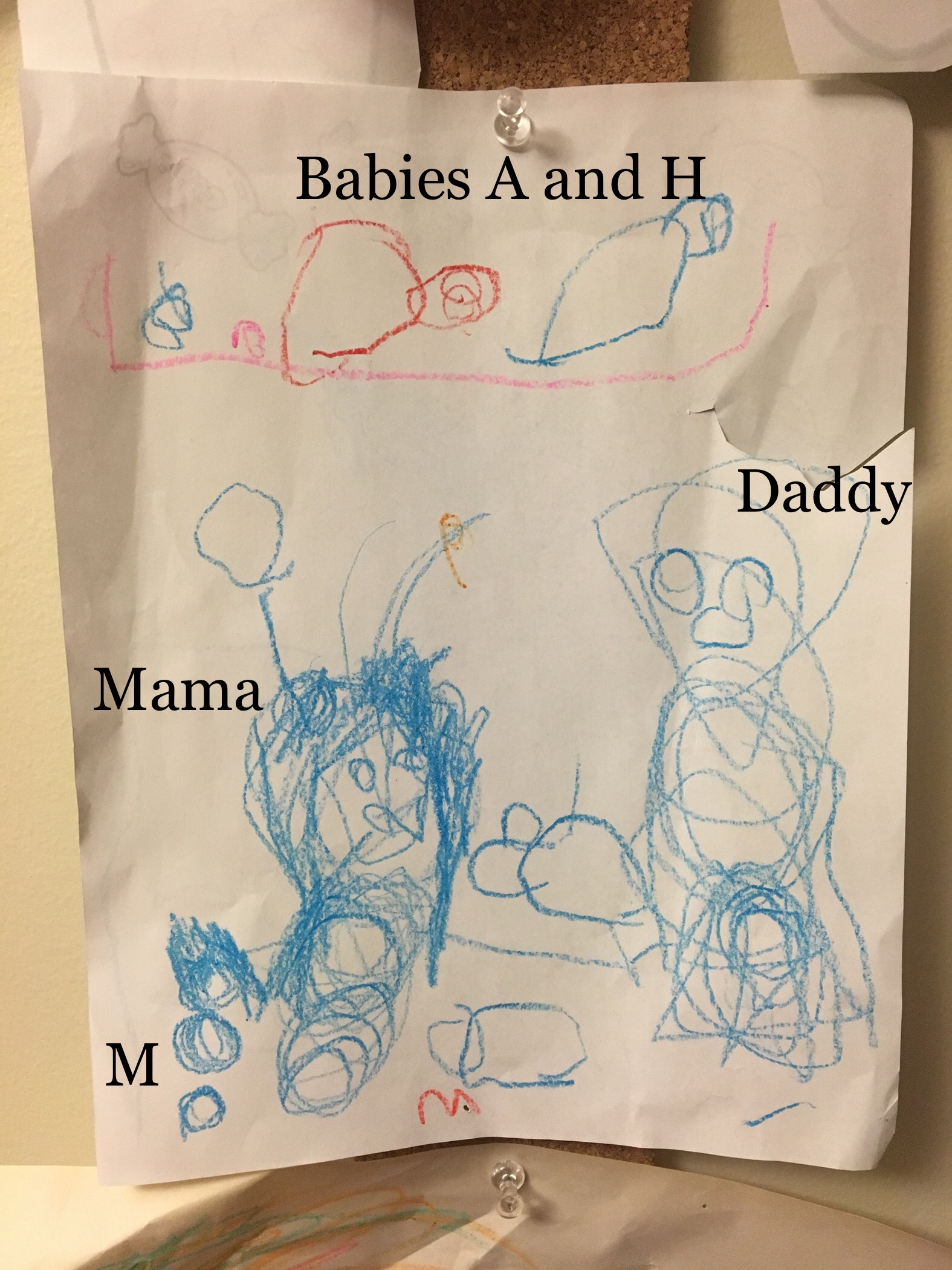 Family Portrait by M, age 4. Crayon on paper.