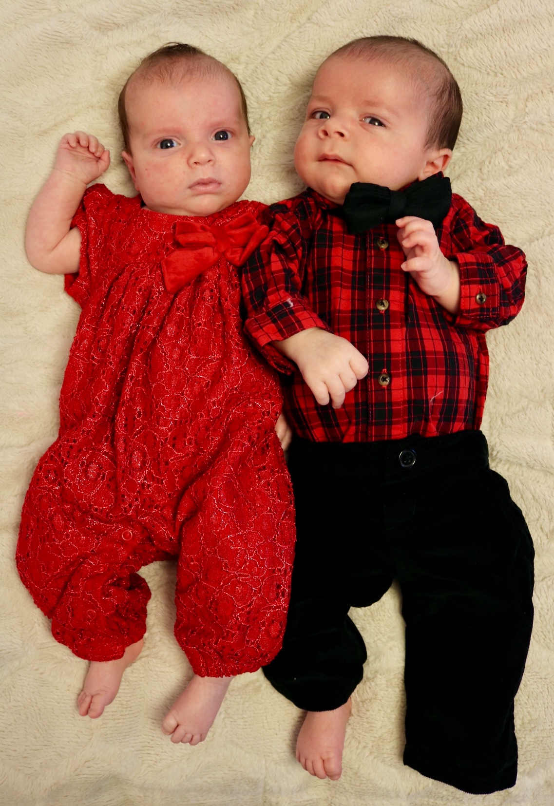 We had a few folks over for dinner last night (nine people around the table, plus twins in various arms), and, as usual, I was so busy hosting and enjoying that I neglected to snap any photos.  Luckily, I did take a few minutes before the shenanigans got under way to catch the twins (age 6.5 weeks) in their dinner party outfits.