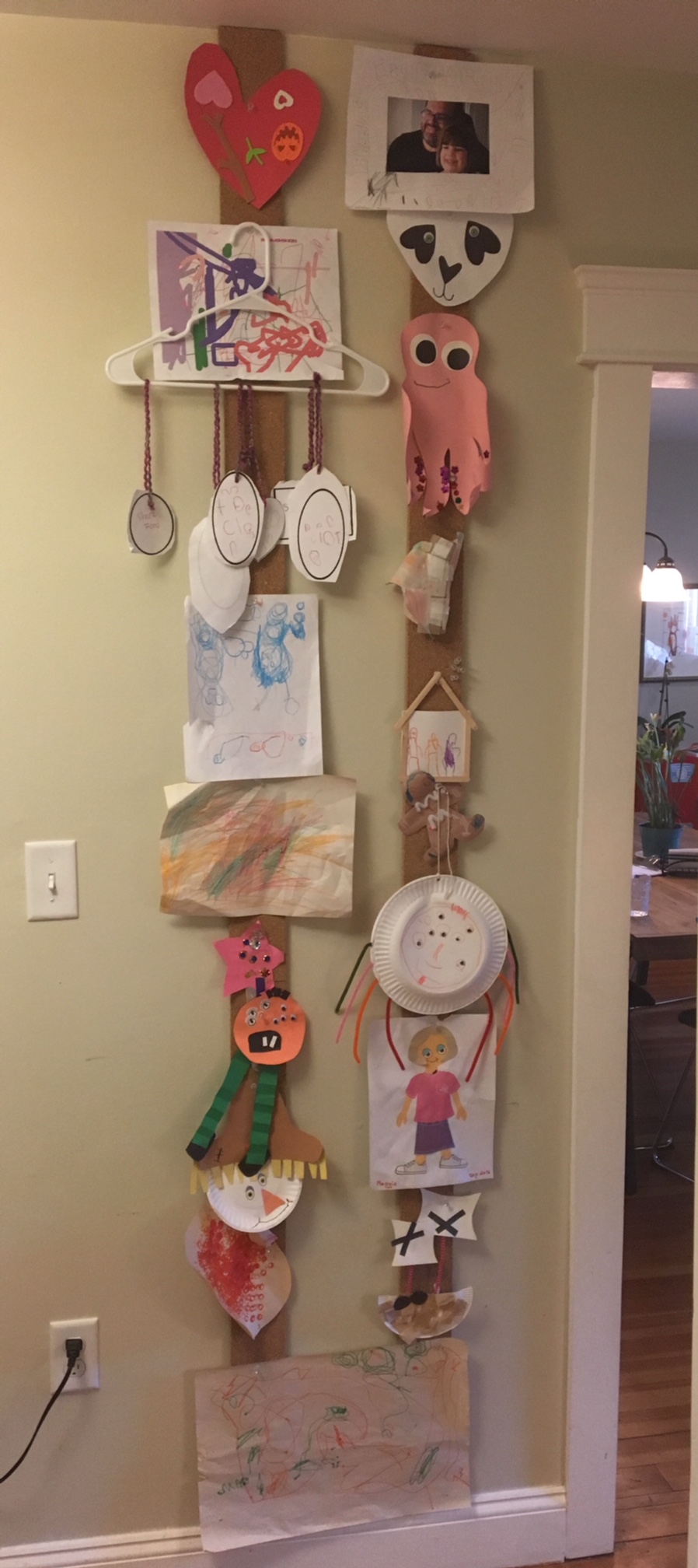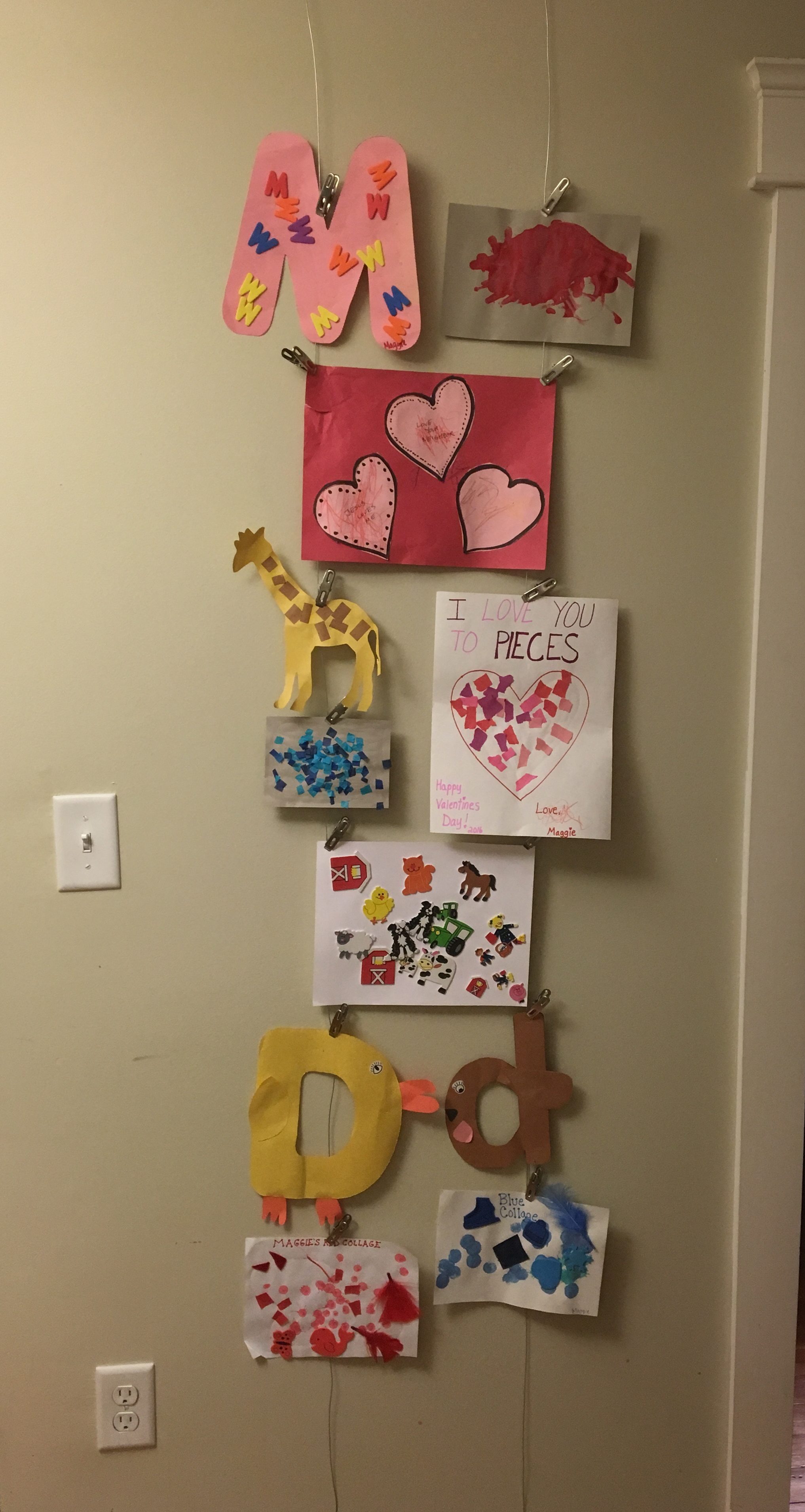 What does a loving parent do with all of this treasure?  Well, this one tried a few different strategies, and the second to last strategy was a kid art wall.  Husband D is a little twitchy about tape on the interior walls (as I discovered the first Holiday season during which we cohabited, when I scotch taped all the cards we received to a door frame and he had a verrry quiet conniption.  Now I use painter’s tape.  Much better.), so I surfed Pinterest (briefly — I am a bad Pinterester) and eventually settled for stringing wires on the wall and clipping the projects to them.  The available wall was mostly vertical, however, so I did something I hadn’t seen on Pinterest: I mounted the wires vertically (with Command hooks at the top and bottom).  It ended up looking like this.