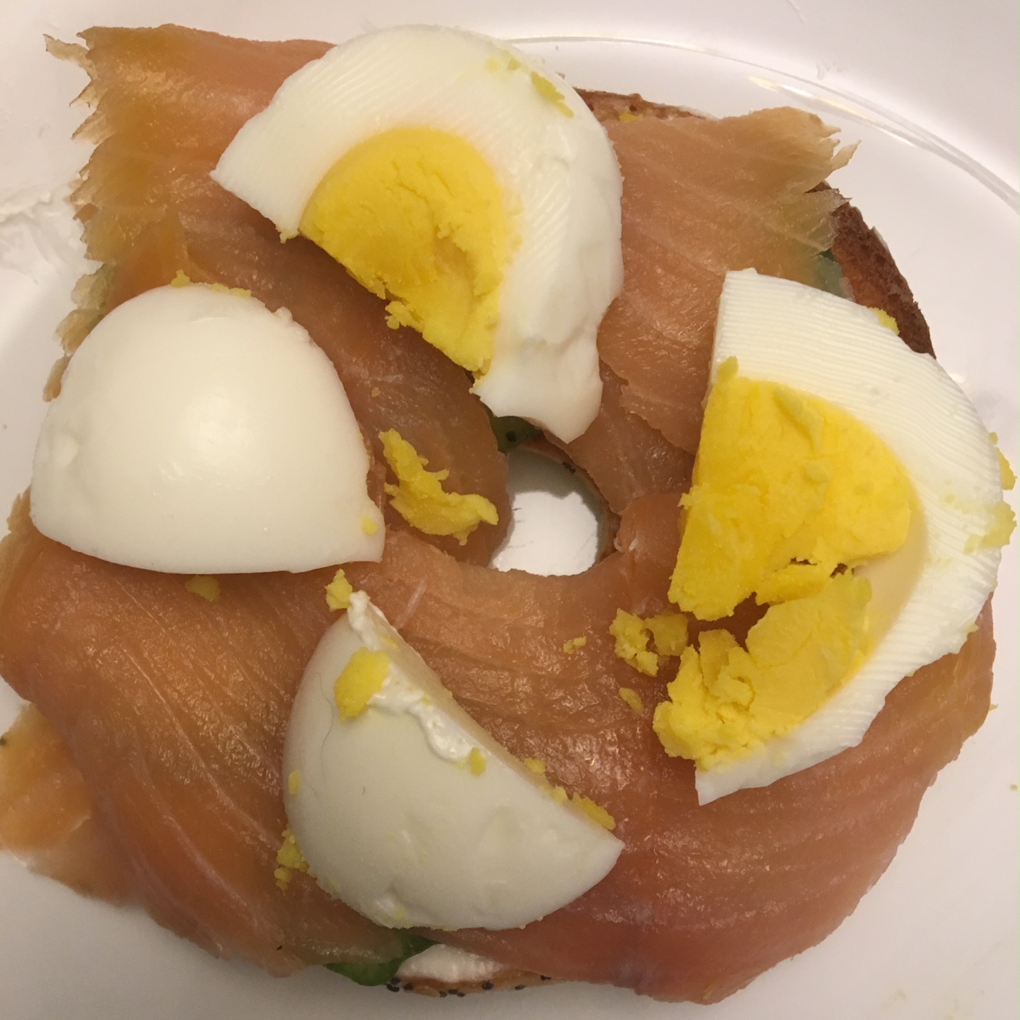 I sliced one of the eggs to add to my breakfast of bagel thin, cream cheese, cucumbers, and smoked salmon.  Here’s half of the resulting yumminess.  (If you care about WW points, both halves totaled 5 FSP.  Three for the bagel thin, two for one tablespoon of cream cheese.  The cukes, salmon, and eggs are zero.)
