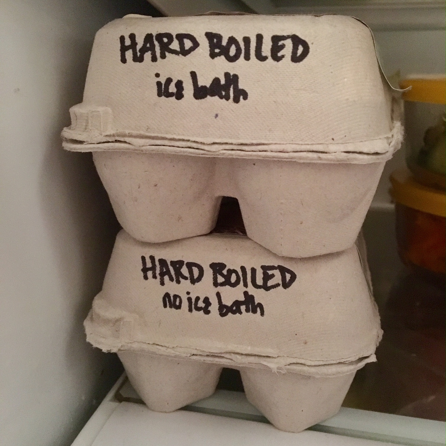 If, on the other hand, you have used all your ice to make G&Ts, feel free to just plop the cooked eggs back into the carton or into a bowl and put them back in the fridge.  Note that if you live with anyone with whom you typically share groceries, it is a kindness to communicate to him/her/them somehow that these particular eggs are already cooked.  Otherwise: s/he goes to crack an egg for a scramble and — what?!  Not that I know this from experience or anything.